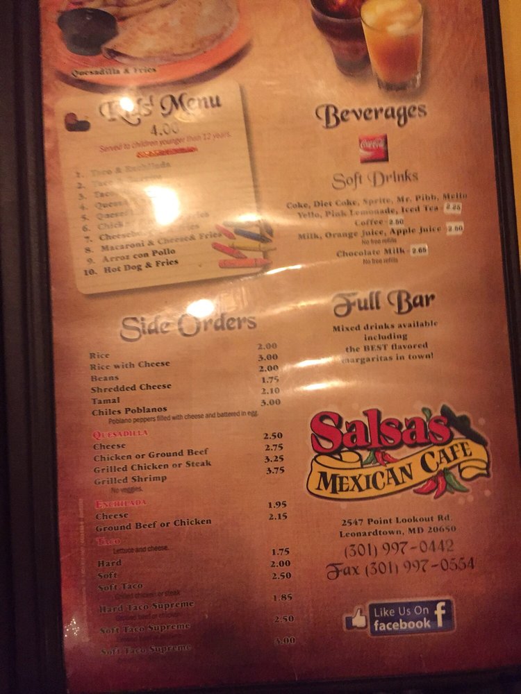 Introducing the menu at Salsa's Mexican Cafe, a popular dining spot in Leonardtown, MD, offers a diverse range of options in the categories of burgers, Mexican, and seafood. This casual restaurant is known for its quick service, pleasant staff, and delicious food. Customers rave about the extensive menu with a whole section dedicated to vegetarians, generous portions at reasonable prices, and quick, hot dishes that never fail to impress. The authentic Mexican cuisine and attentive staff create a welcoming atmosphere, where patrons like to unwind and enjoy a meal with family and friends. With various amenities like outdoor seating, full bar, and Wi-Fi, Salsa's Mexican Cafe is a go-to spot for a satisfying meal experience. Don't miss out on fan favorites like the chimichanga, street tacos, or their famous margaritas.